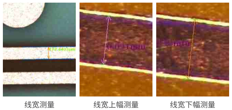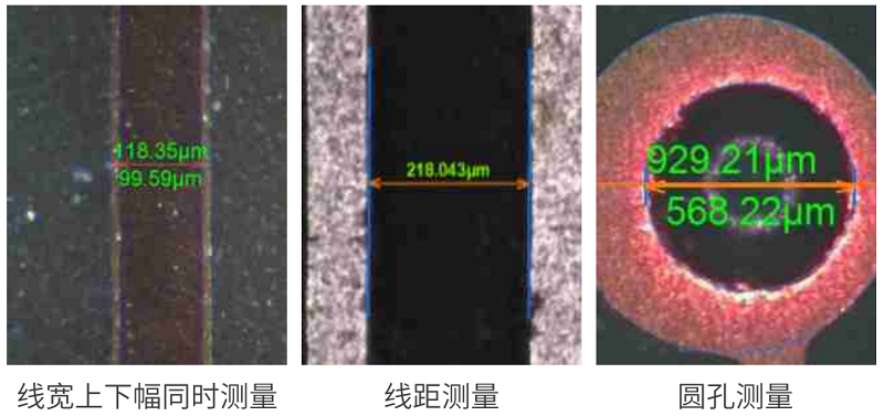 通過影像成像系統及光源從上表面垂直于被測板,呈顯影像(相機實時拍圖)感測,并將圖像傳送至電腦測量軟件,通過軟件測量工具分析圖像的“線寬/線距/線寬上下幅/圓/金手指線寬等”標準公差值對比,從而判斷被測板上的測量值OK或NG。